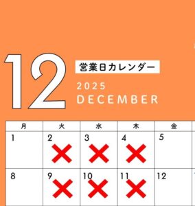 金沢市エアコンクリーニングの『きれい製作所』です♪ 2025年も残すところあと1ヶ月を切りましたね。今月の営業日カレンダーです。 ❌印のところは既にご予約を頂いているお日にちになります。 年末年始に向けて徐々にご予約頂い […]