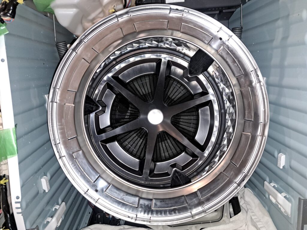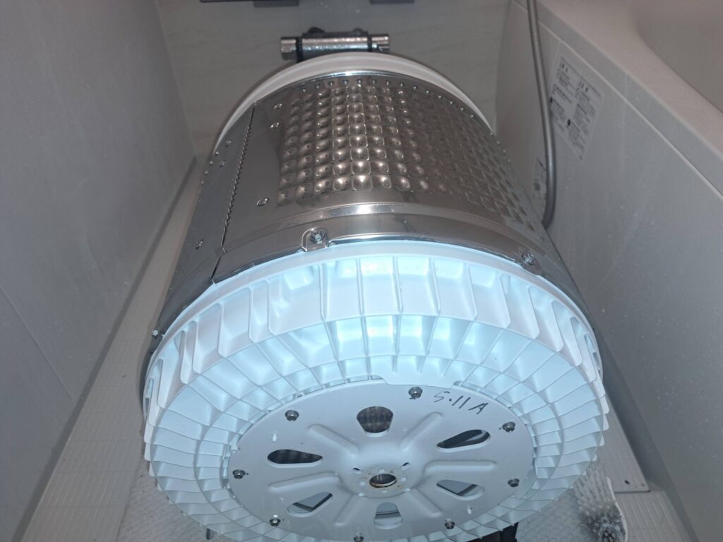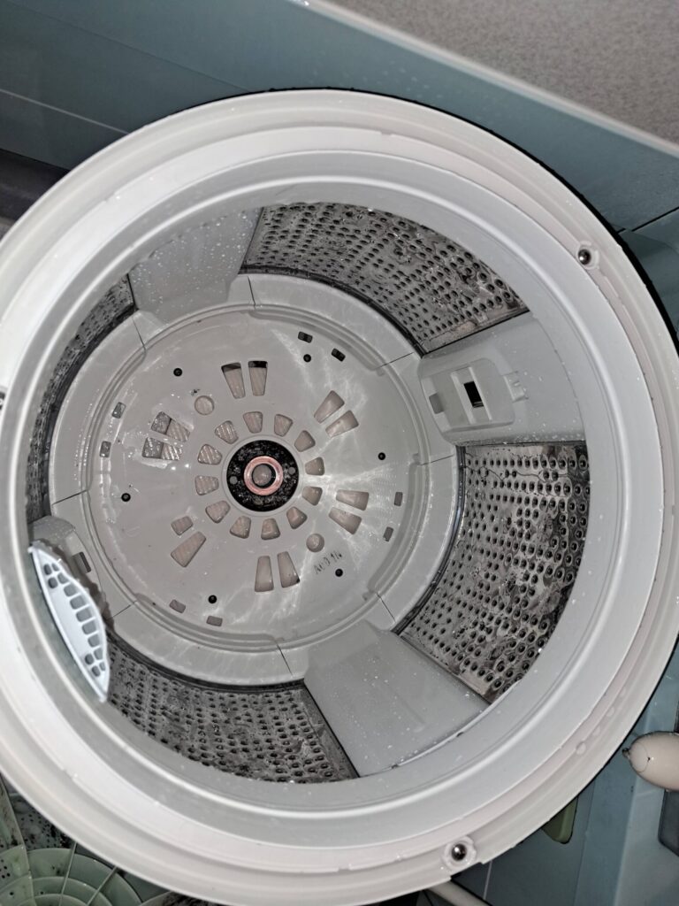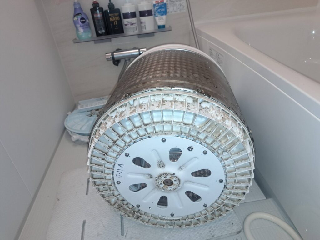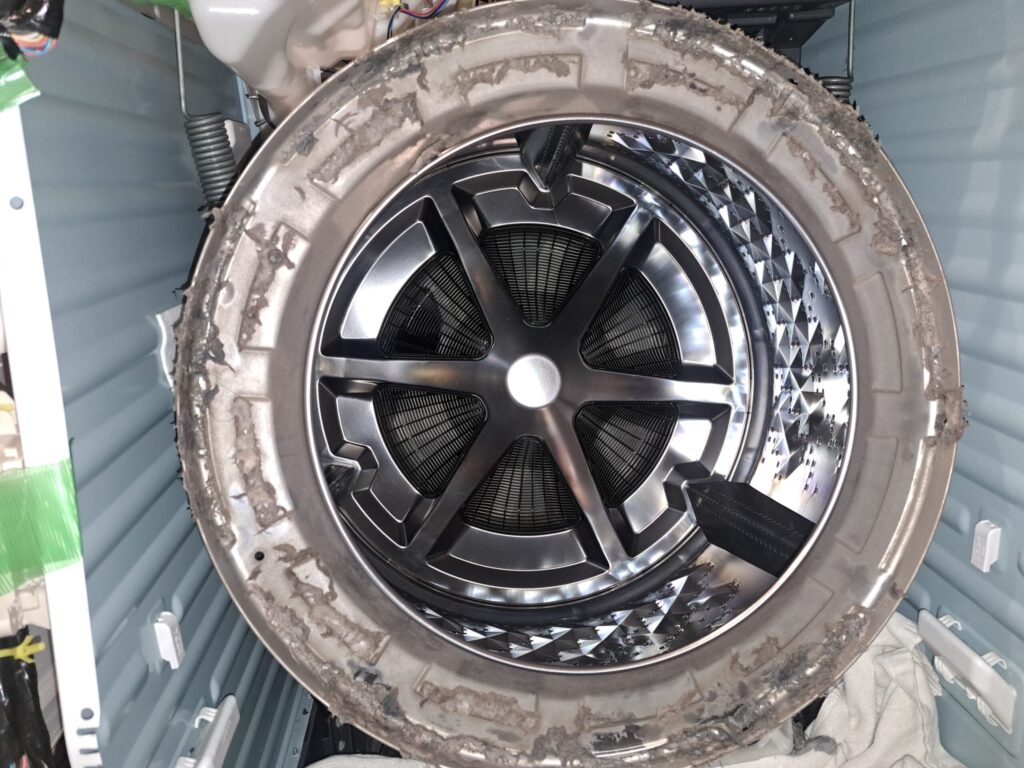 当店では洗濯槽を取り外し、洗濯槽も分解できるところは分解して汚れを削り落としていきます。